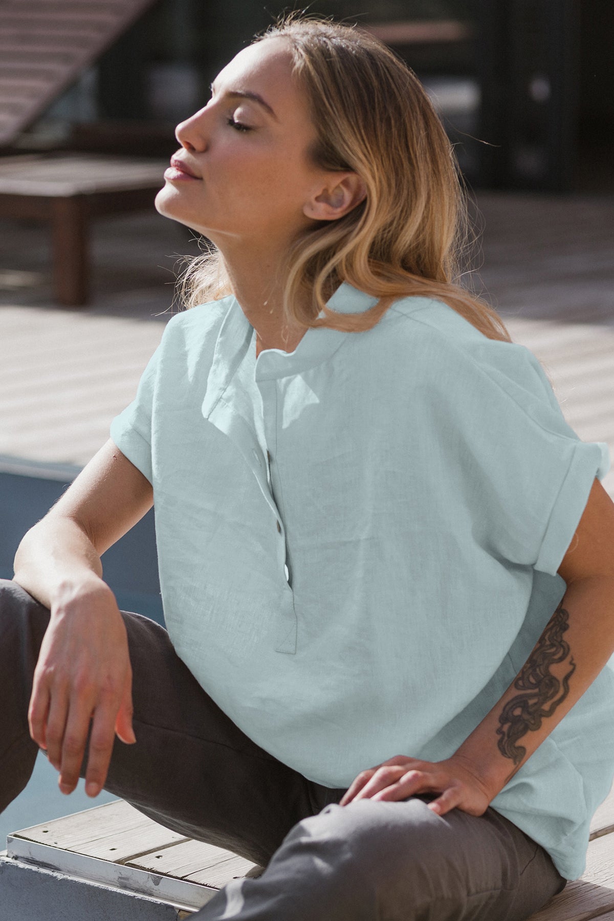 Blusa feminina de mangas curtas em linho azul glaciar - Flor