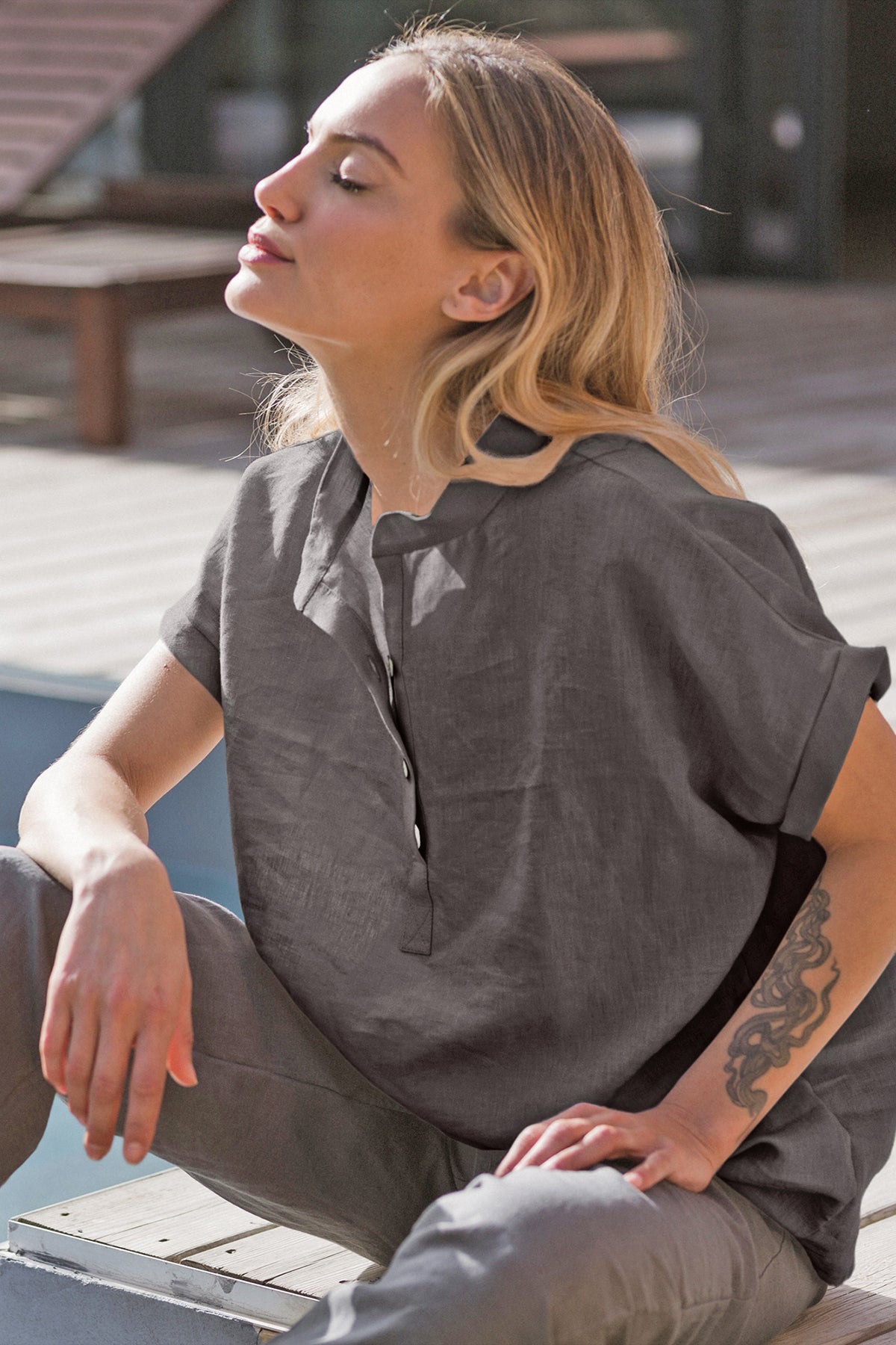 Blusa feminina de mangas curtas em linho cinza chumbo - Flor