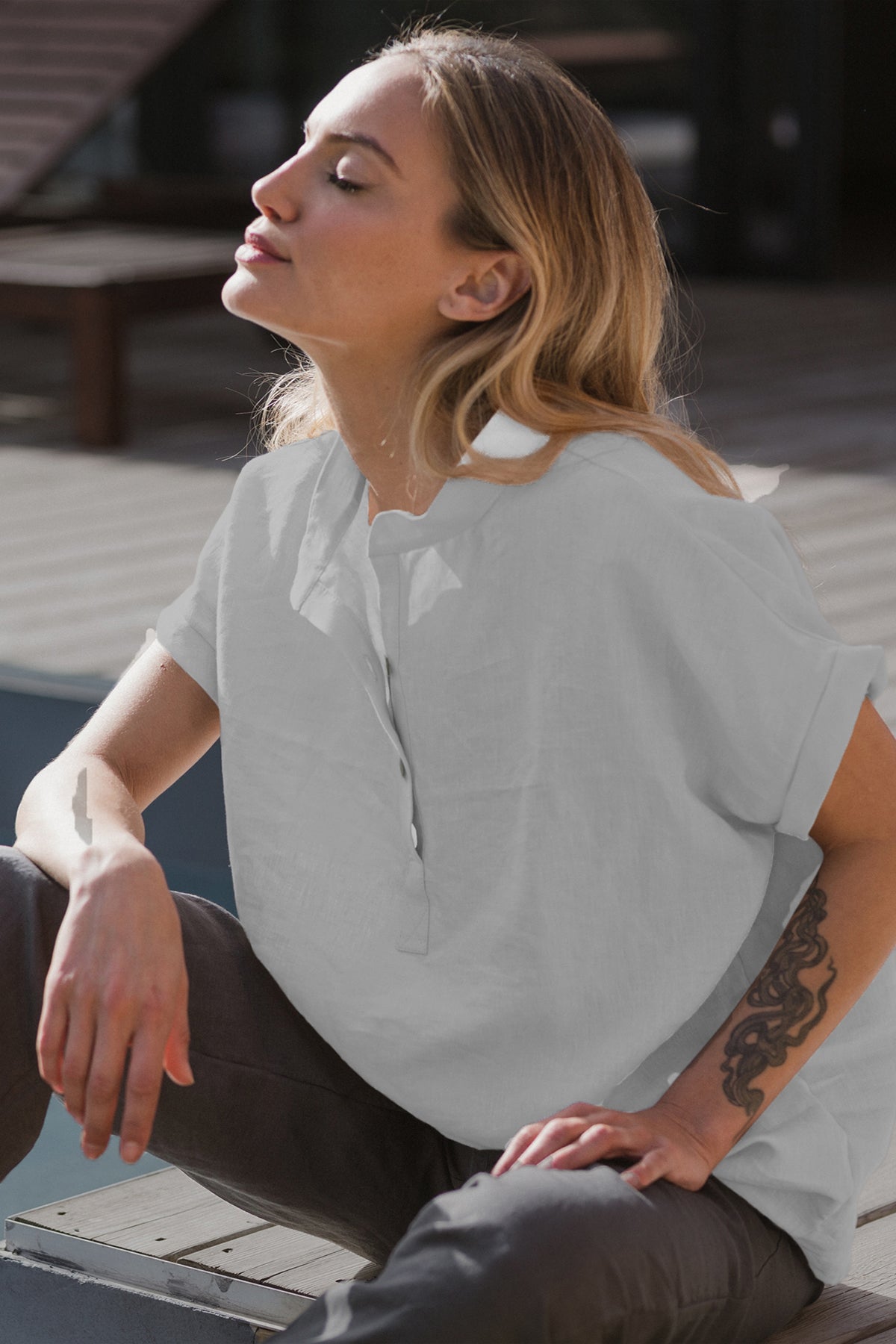 Blusa feminina de mangas curtas em linho cinza mineral - Flor
