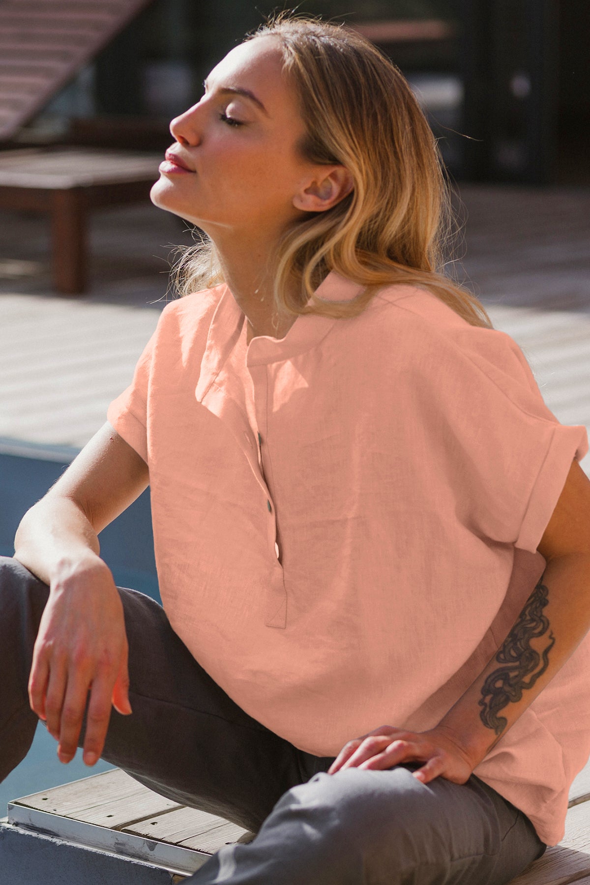 Blusa feminina de mangas curtas em linho rosa velho - Flor