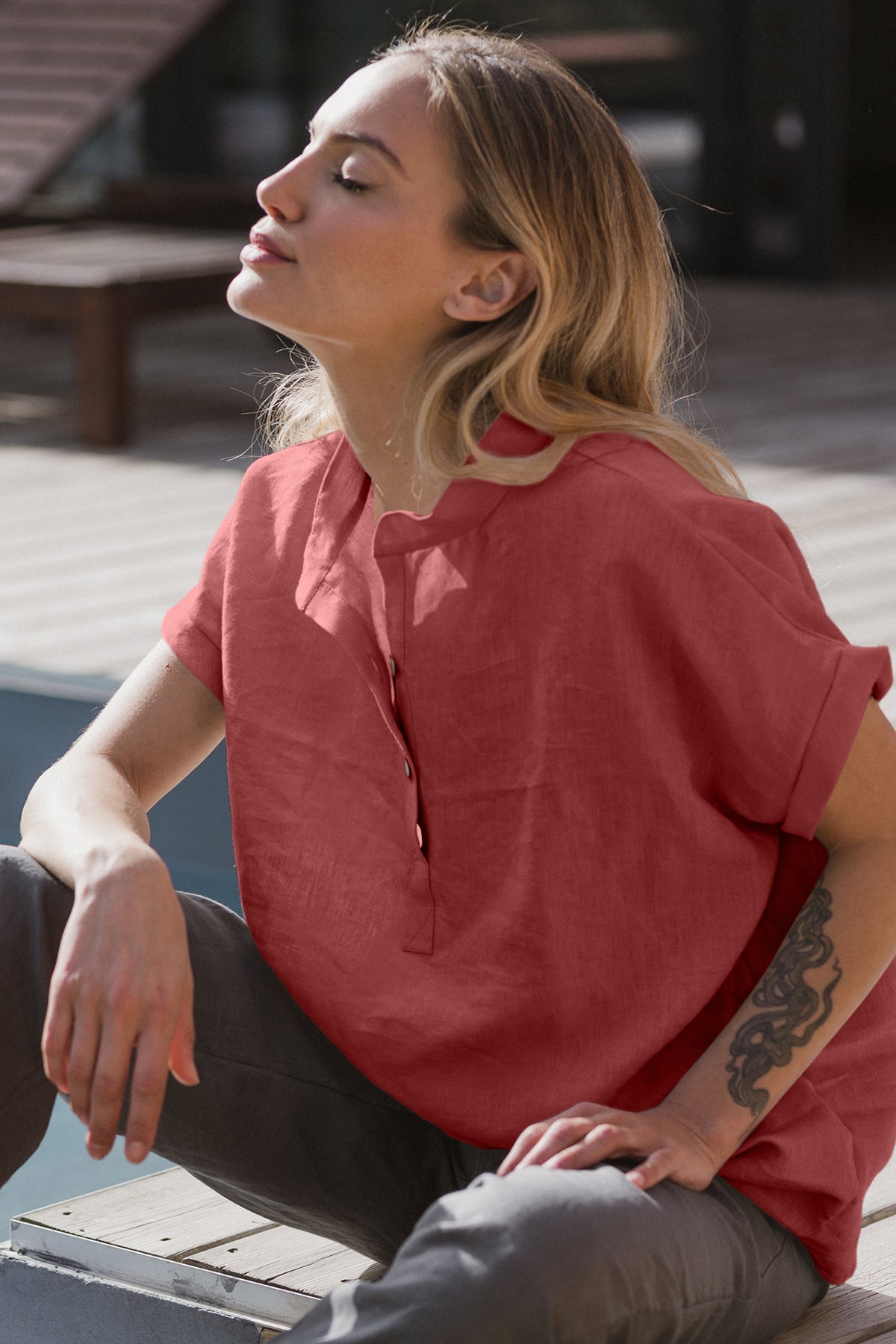 Blusa feminina de mangas curtas em linho tijolo - Flor