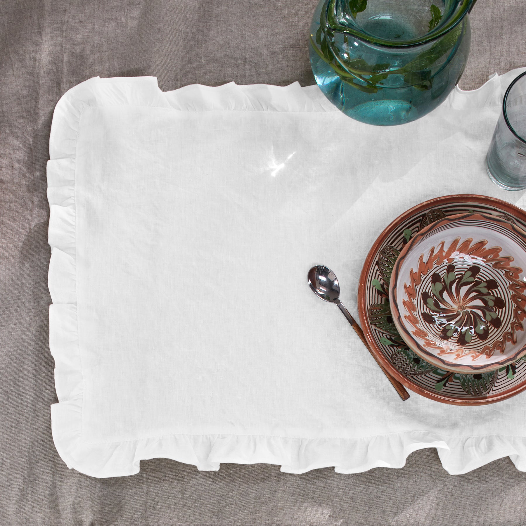 Conjunto de 4 ou 6 individuais com folhos em linho lavado branco